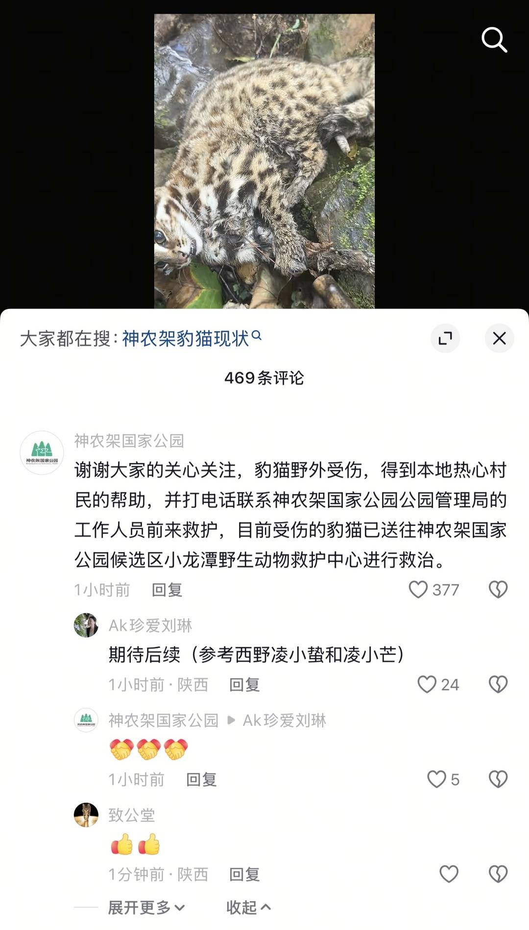 10月9日,在饶先生的驳倒区,神农架国度公园科罚局进行了修起:豹猫荒凉受伤,获得腹地关爱村民的匡助,并打电话干系神农架国度公园科罚局的职责主说念主员前来救护,现在受伤的豹猫还是送往神农架国度公园候选区小龙潭野灵活物扶持中心进行救治。