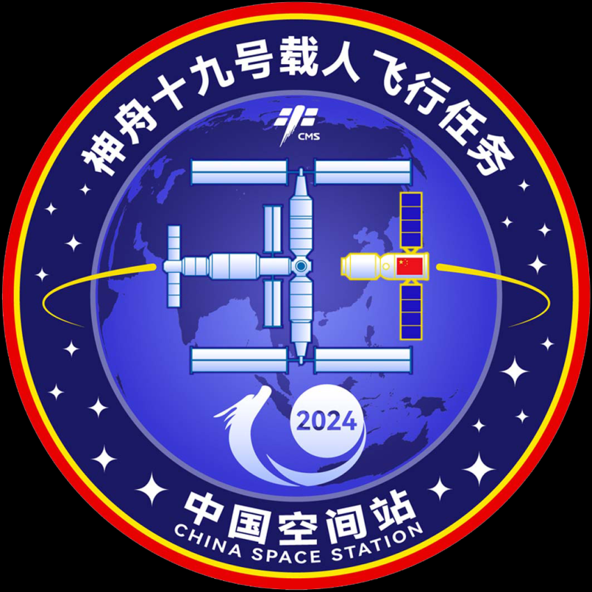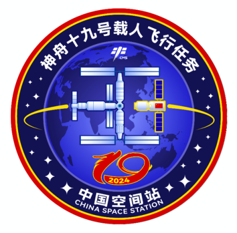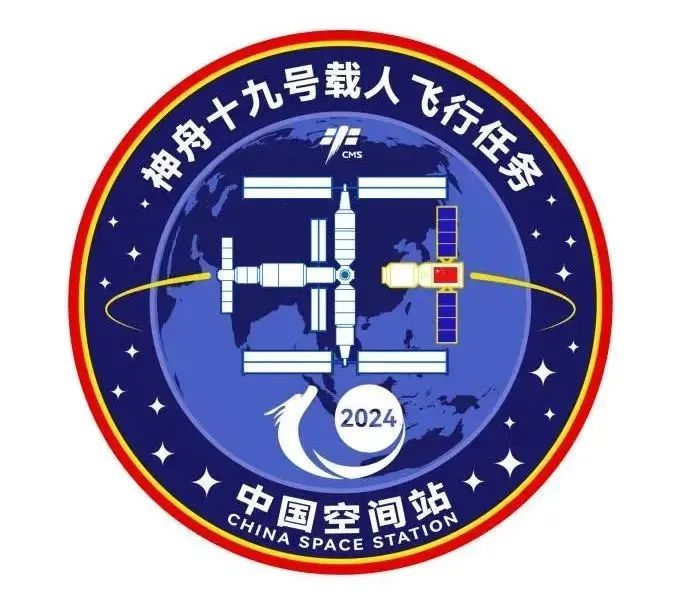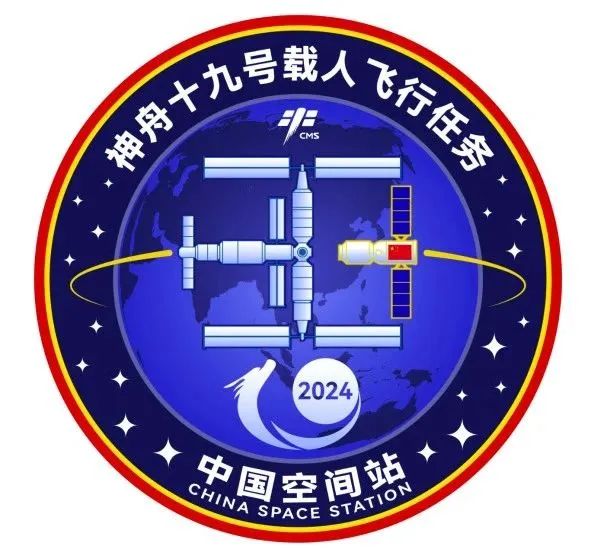 神舟十九号载东谈主遨游任务标志筹划,是由中国空间站、神舟十九号载东谈主飞船、地球、星空等图案组成的一个蓝红黄配色的圆形徽章。